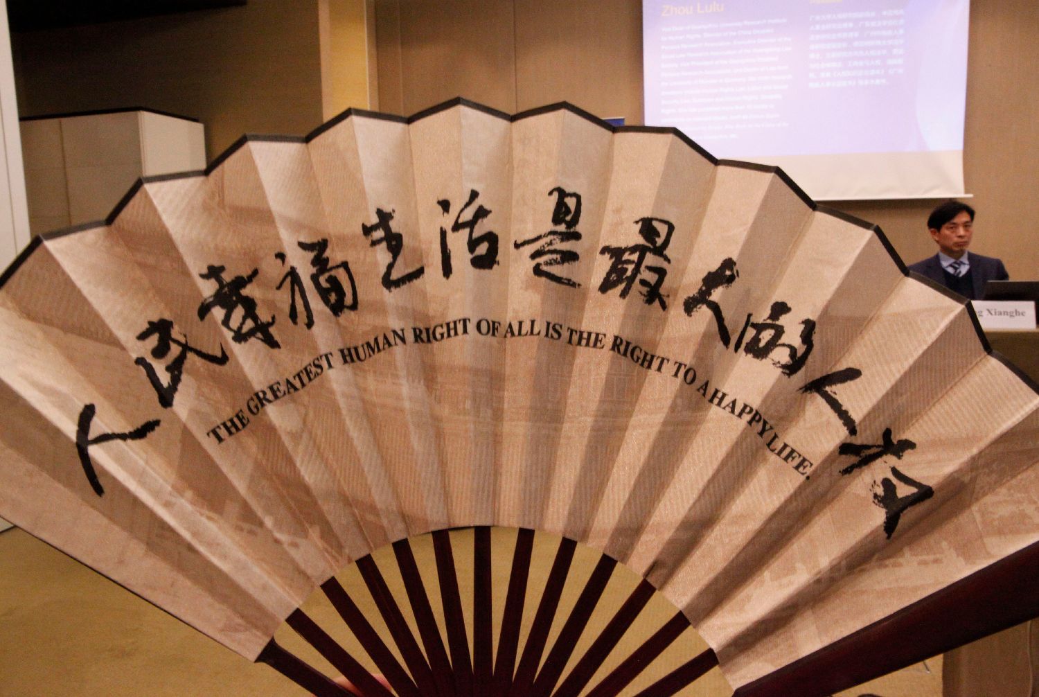图为会议纪念品中国折扇,上写“人民幸福生活是最大的人权”。