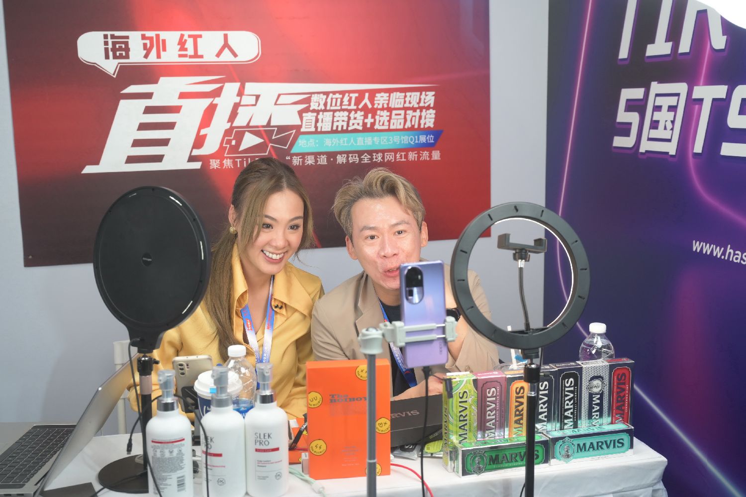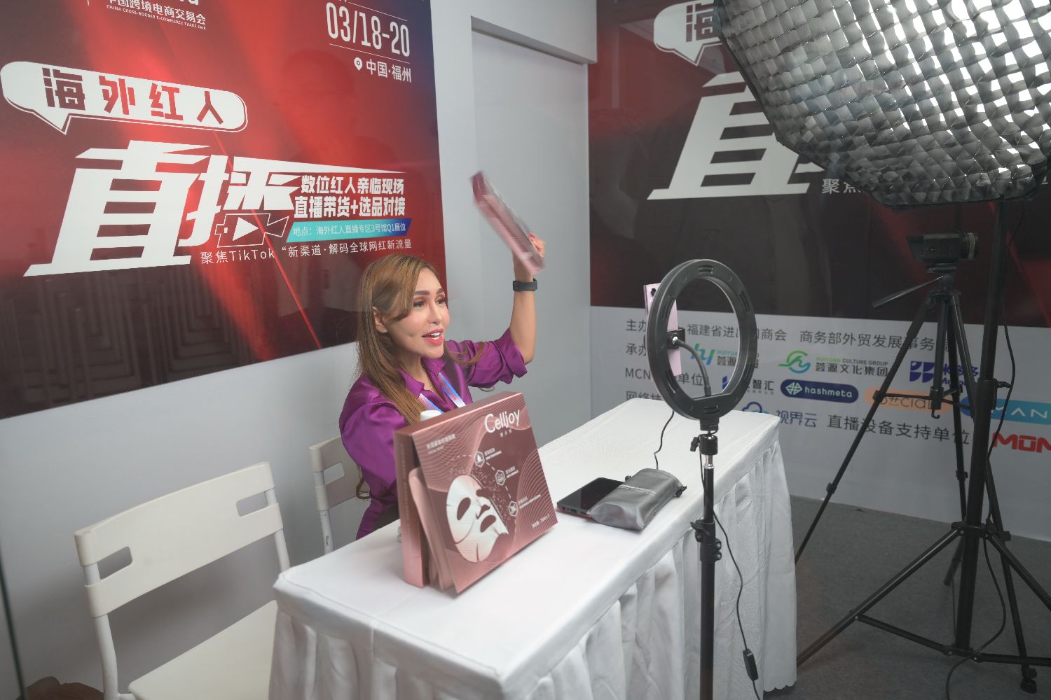 3月19日,新加坡主播在展会现场直播带货。