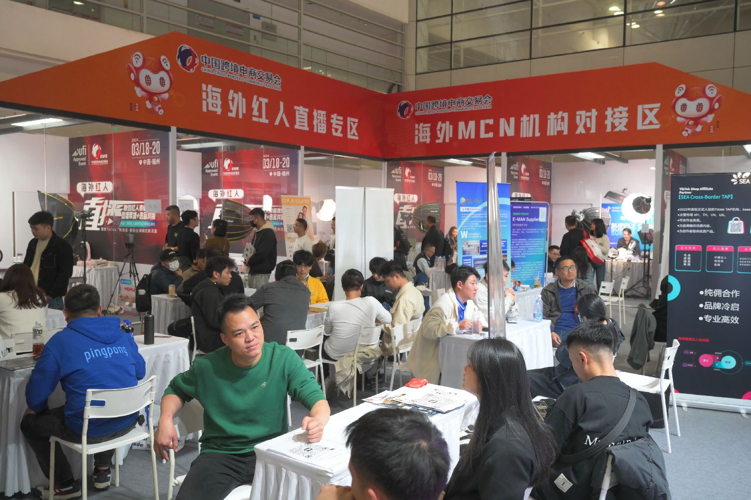 3月19日,客商在第四届中国跨境电商交易会海外MCN机构对接区交谈。