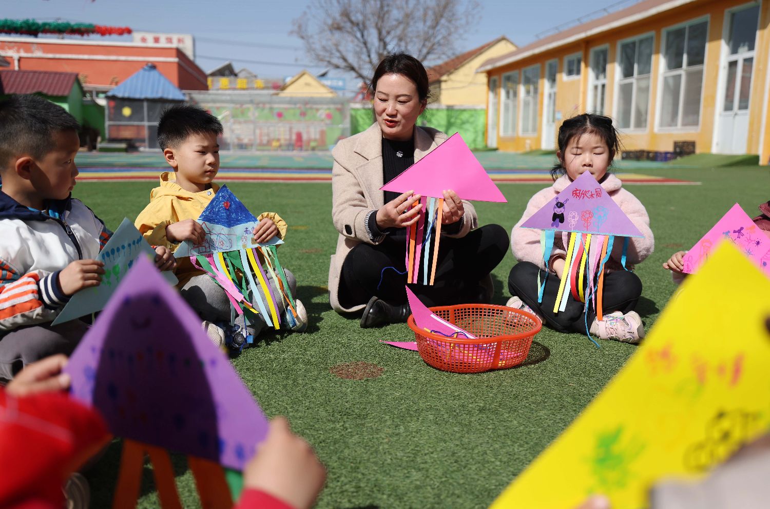 3月19日,在山东省临沂市沂南县湖头镇中心幼儿园,小朋友在老师的带领下制作手工风筝。(图片来源:本文图片均据新华社)