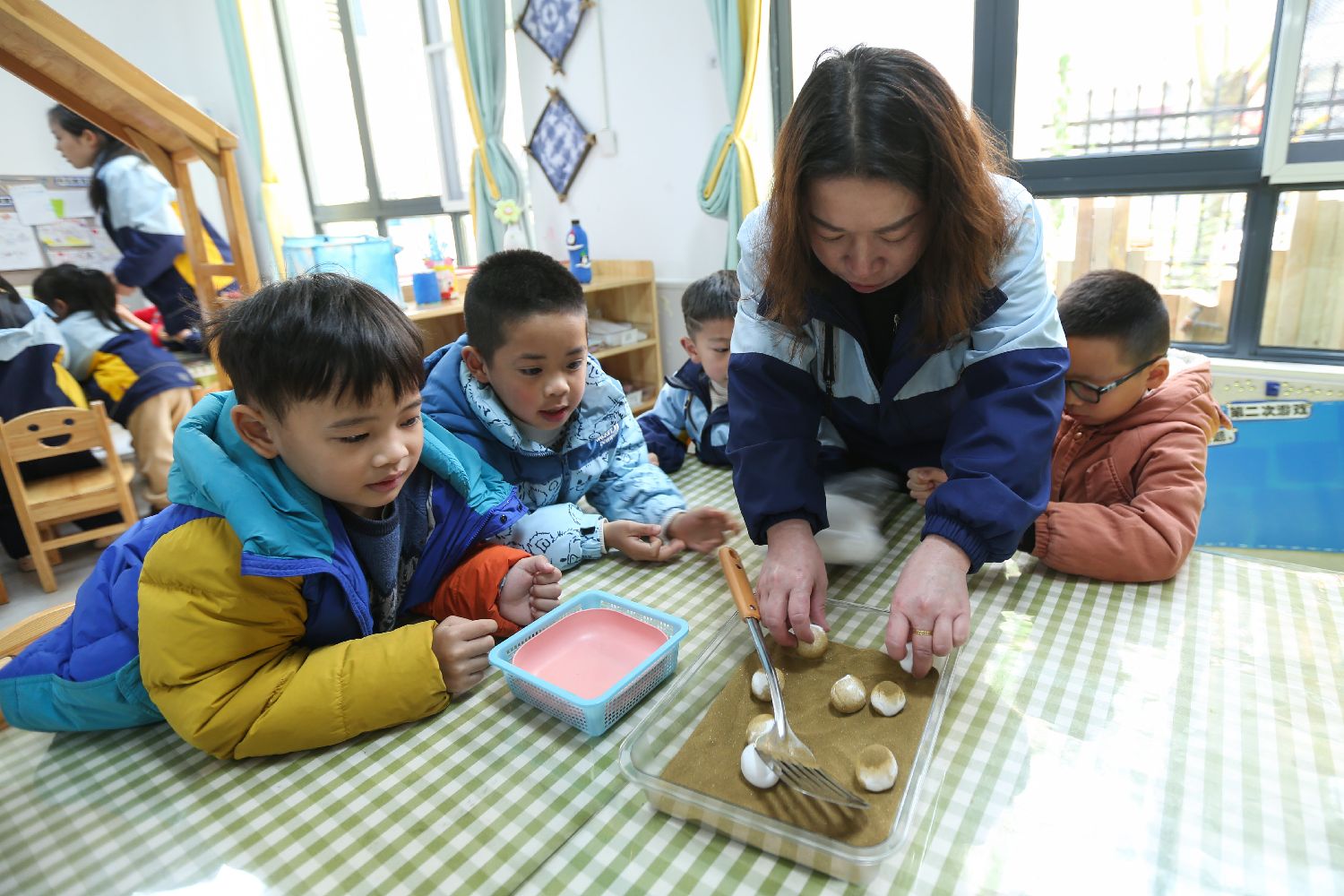 3月19日,河南省沁阳市第一幼儿园小朋友在玩立蛋游戏。