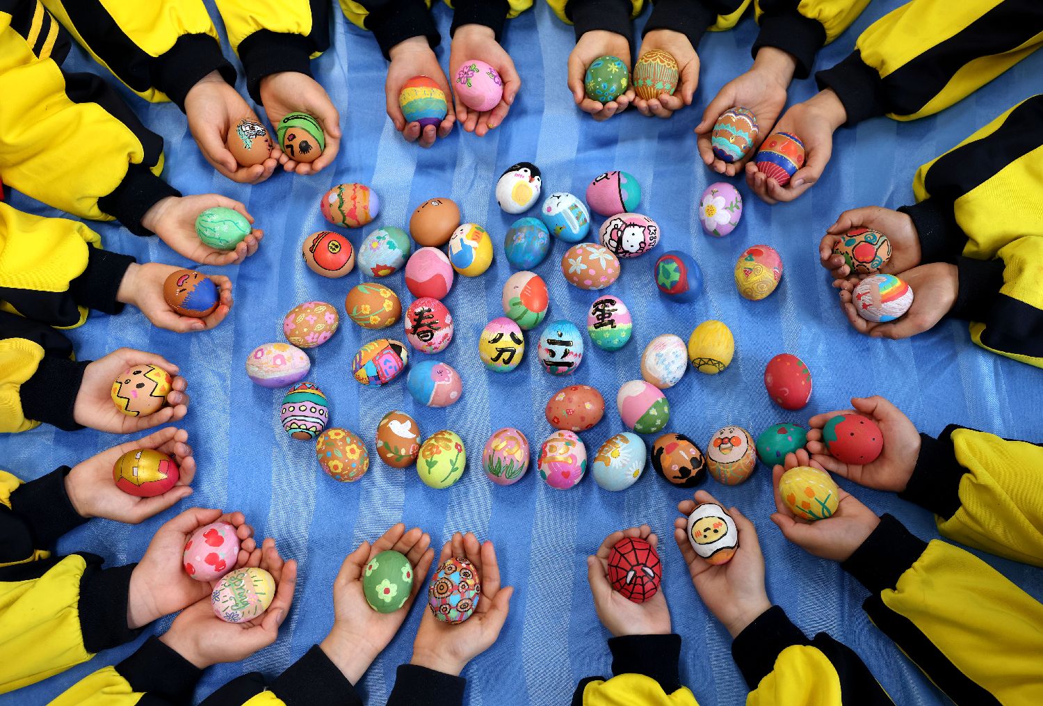 3月19日,在山东省枣庄市文化路小学,学生们展示绘制的彩蛋。