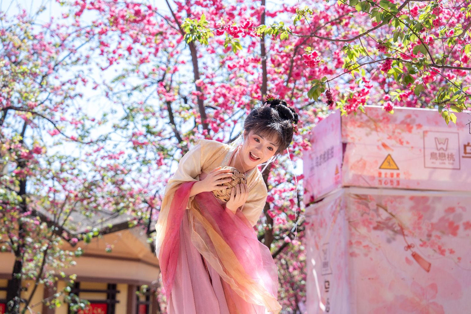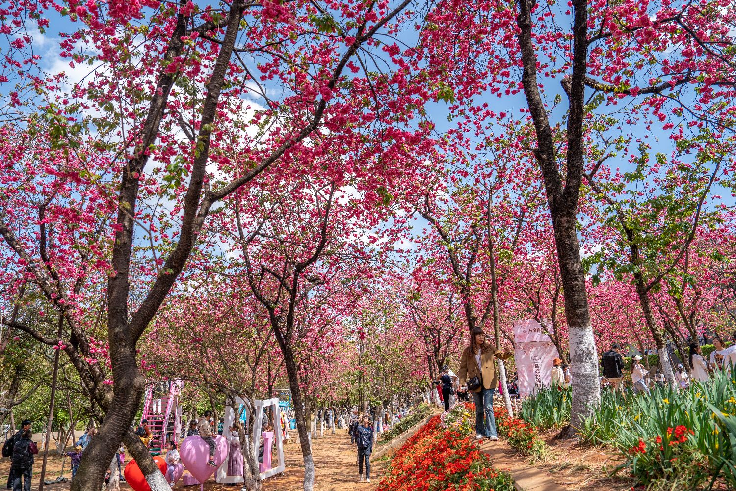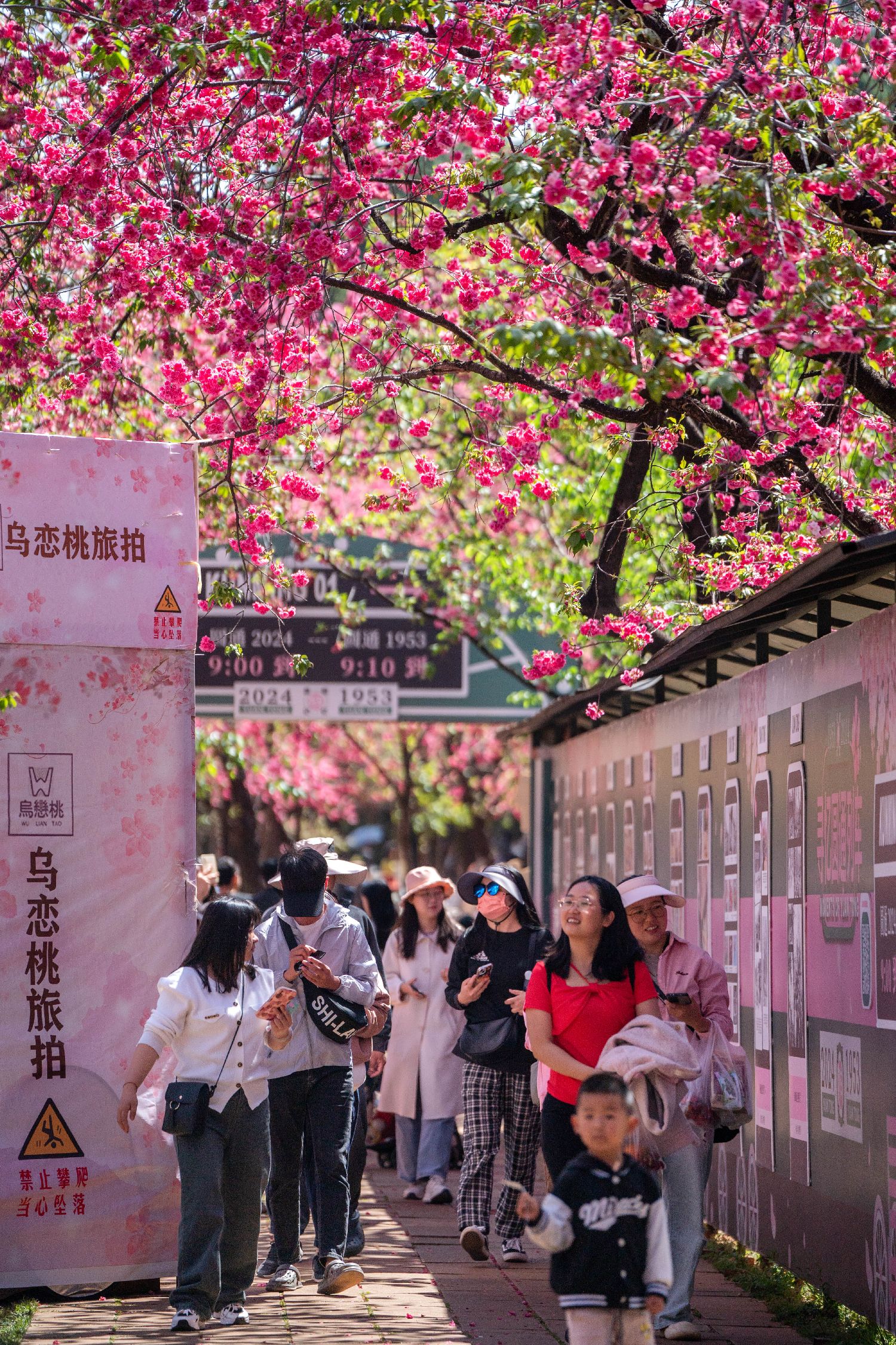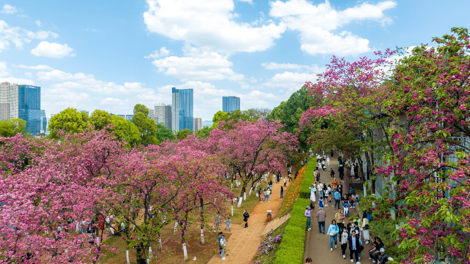 近日,云南昆明圆通山公园的樱花进入盛花期,吸引众多市民和游客前来观花赏景,乐享春日时光。