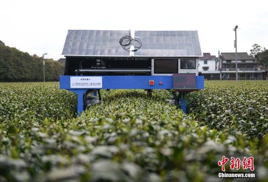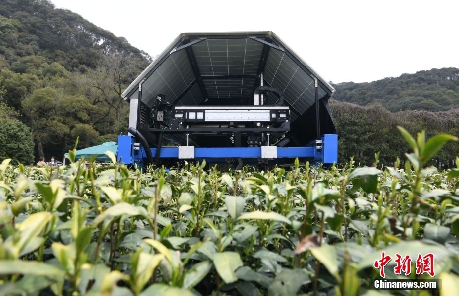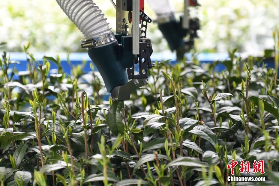 图为3月26日,智能采茶机器人采摘西湖龙井茶。(图片来源:中新网)