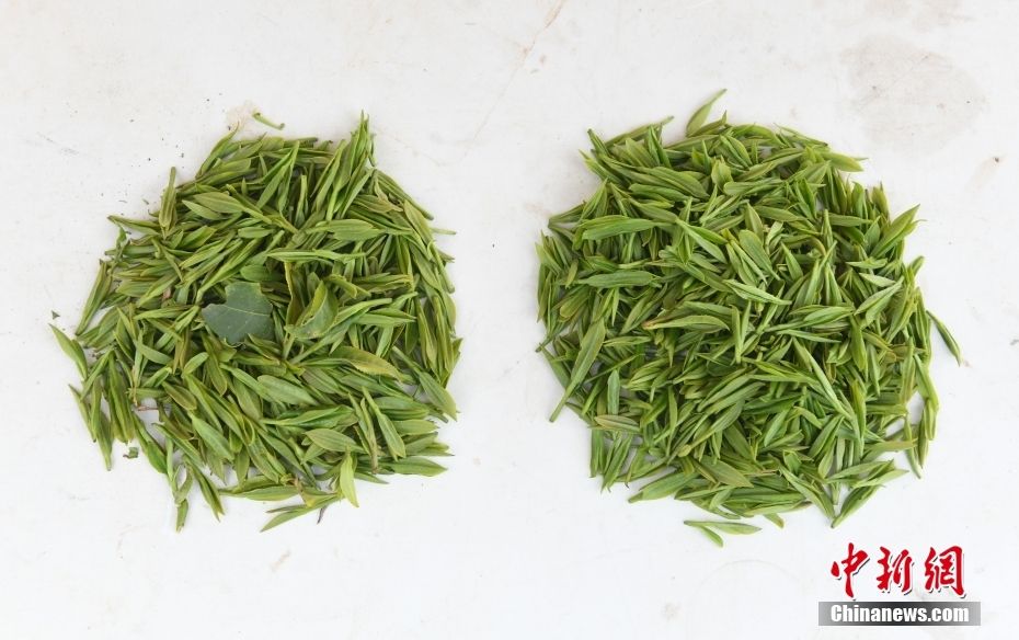 图为3月26日,智能采茶机器人采摘的西湖龙井(左)和采茶工采摘的西湖龙井(右)对比。(图片来源:中新网)