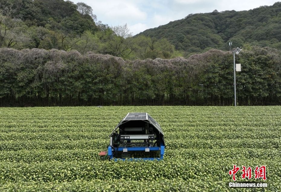 图为3月26日,智能采茶机器人在龙井茶园内采摘新茶。(图片来源:中新网)