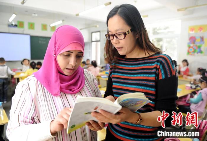 在铜陵市铜官山区露采小学一年级(2)班的语文课上,来自也门的尤诗娜请教老师问题。尤诗娜与女儿同桌学习,聚精会神地和其他学生一起听老师讲课。(图片来源:中新网)