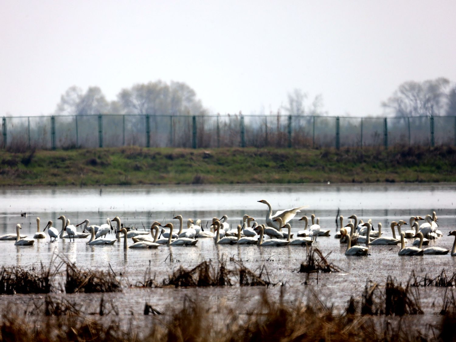 3月11日,珍稀候鸟栖息于湖南沅江市明朗山天鹅湖。(图片来源:中新社)