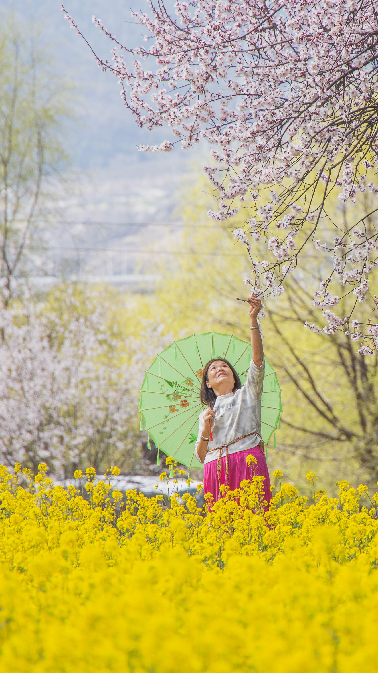 游客在林芝市巴宜区朵当村的油菜花田里拍照留念(4月6日摄)。