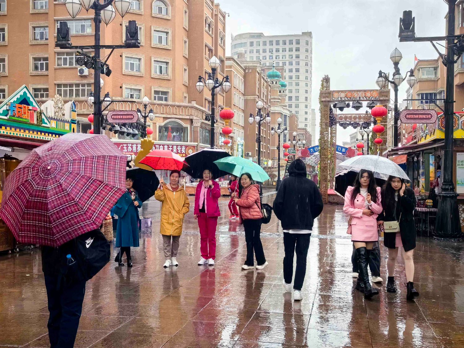 12时许,新疆国际大巴扎景区内游客撑伞游览。(图片来源:中新社)