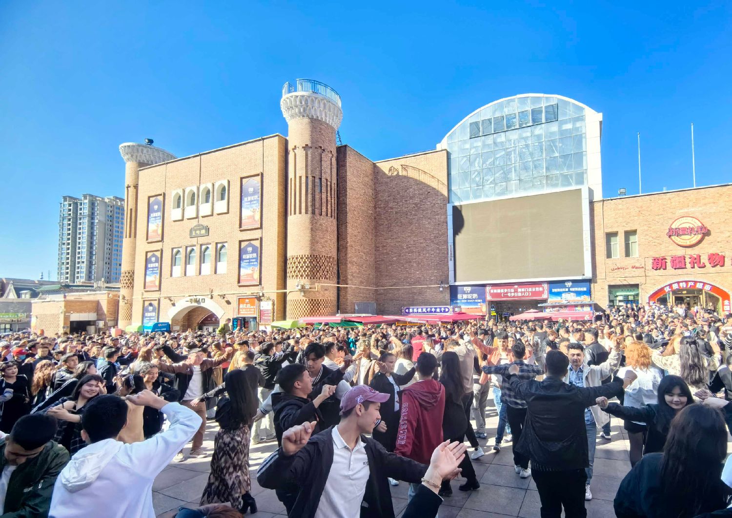 17时许,新疆国际大巴扎景区的观光塔下犹如“舞蹈的海洋”。(图片来源:中新社)