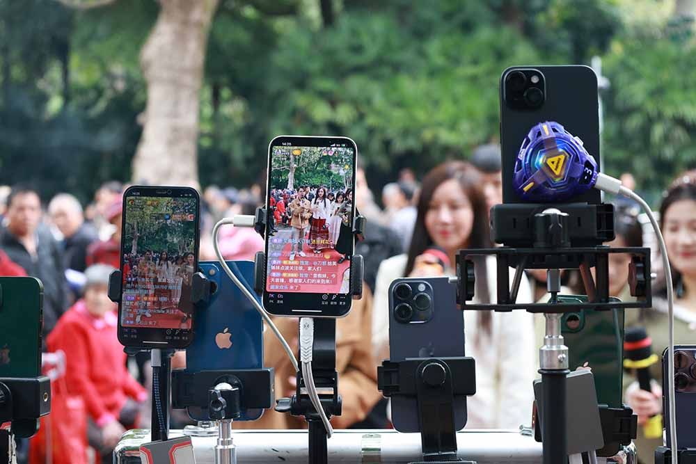 中新社报道,在中国一短视频平台拥有百万粉丝的“网红”山三妹,声情并茂地对着十余个手机镜头直播唱山歌。在她身后,大批年轻的徒弟轮流跟着对唱,现场学习。