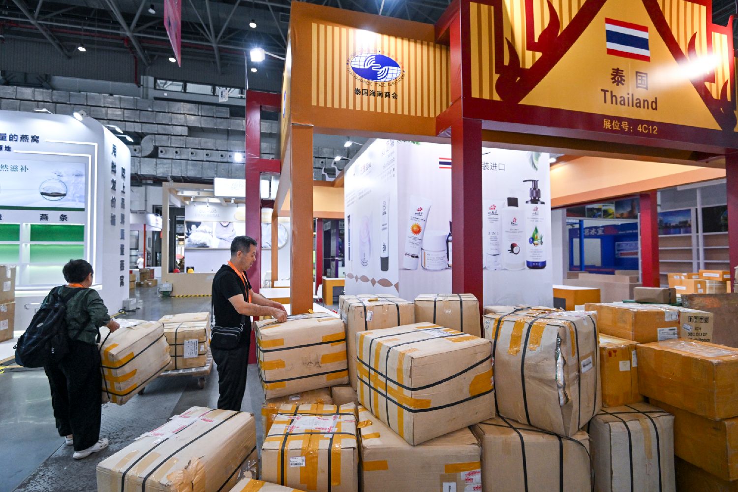 4月10日,第四届中国国际消费品博览会参展物品陆续上架。图为来自泰国的参展商整备参展商品。(图片来源:中新社)