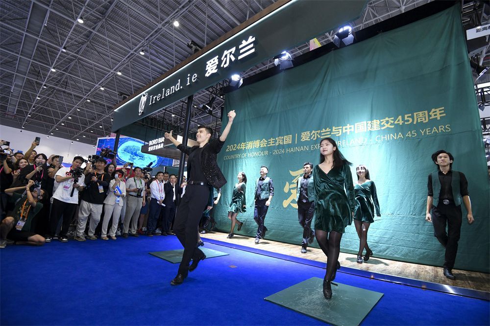 4月13日,海南海口,第四届中国国际消费品博览会主宾国爱尔兰国家馆开馆。展馆面积达500平方米,共组织29家爱尔兰企业及官方机构参展,馆内设置高端酒类、食品乳制品、科技服务、旅游体验、创新设计等5大产业展区。图为爱尔兰国家馆开馆仪式上的踢踏舞表演。(图片来源:本文图片均自中新社)
