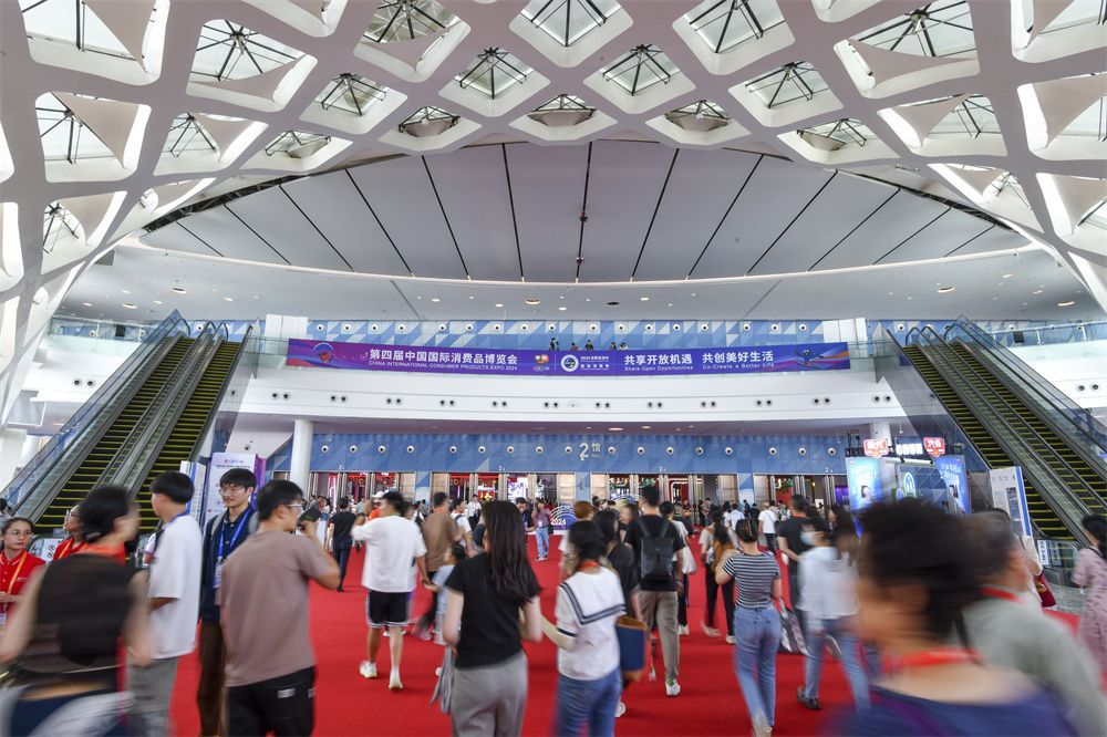 4月13日,以“共享开放机遇、共创美好生活”为主题的第四届中国国际消费品博览会在海南海口开幕,将持续至4月18日。本届消博会吸引来自71个国家和地区的4000多个品牌参展。图为参观者陆续步入展馆。