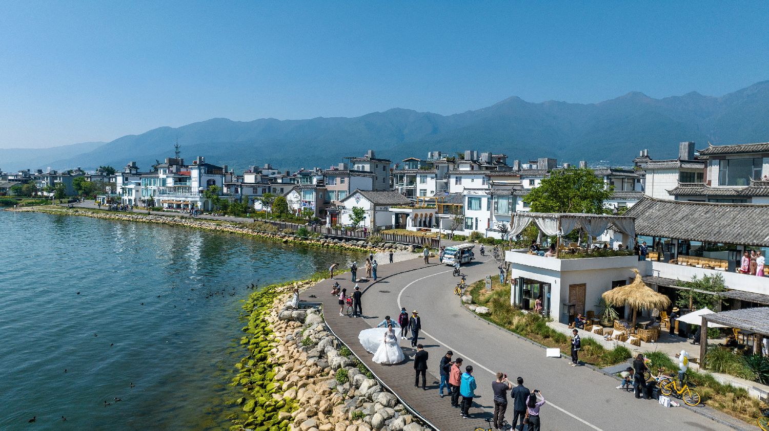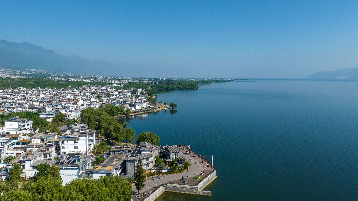 人们在大理市洱海边的生态廊道游玩(无人机照片,4月14日摄)。(图片来源:本文图片均据新华社)