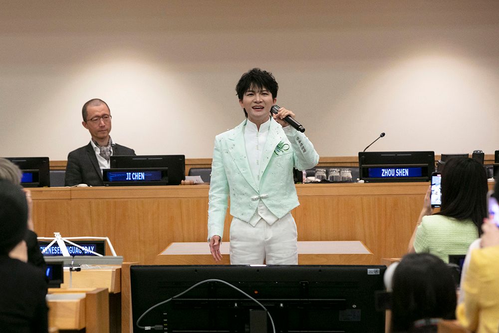 联合国第十五届中文日系列庆祝活动正在纽约联合国总部举行。18日,联合国中国书会牵头举办主题为“载言载乐,和合共生”的交流讨论会,歌手周深受邀出席并献唱最新作品《和平颂》。