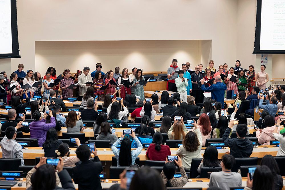 当地时间4月18日,一场主题为“载言载乐,和合共生”的交流讨论会在纽约联合国总部举行。图为歌手周深与由不同国籍联合国职员组成的联合国合唱团共同演唱中文歌《等着我》。(图片来源:中新社)