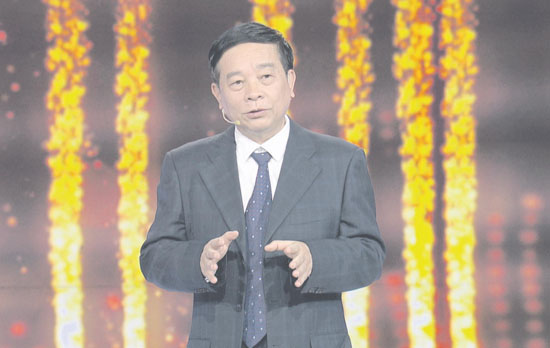 图为王宏甲在福建东南卫视的《中国正在说》节目中演讲。(图片来源:节目组供图)