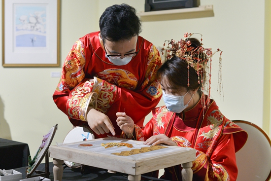 8月14日,一对情侣着汉服婚服在北京摩卡艺术中心体验刺绣。(图片来源:中新社)