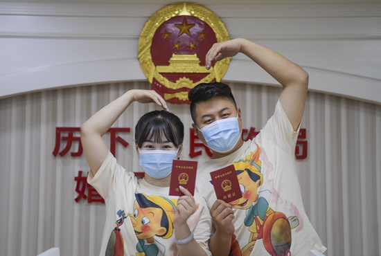 8月14日,济南市历下区婚姻登记处,一对新人领取结婚证后拍照留念。(图片来源:中新社)
