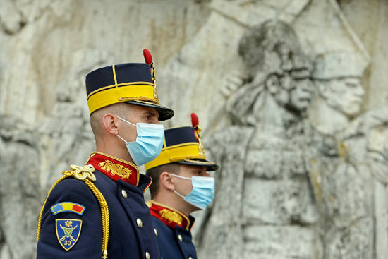 4月29日,罗马尼亚军人在首都布加勒斯特老兵节庆祝仪式上戴着口罩。(图片来源:本文图片均自新华社)