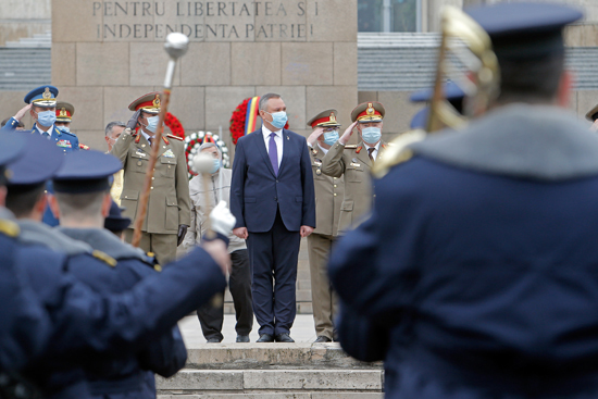 罗马尼亚国防部长丘克(中)在首都布加勒斯特出席老兵节庆祝仪式。