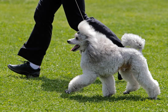 一只宠物犬在罗马尼亚首都布加勒斯特参加选美比赛后随主人离开。