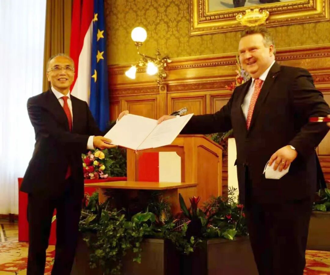 昨天,维也纳市长米夏埃尔·路德维希博士在维也纳市政厅向中国驻奥地利大使李晓驷颁发维也纳大金质荣誉奖章 摄影:Hongbin Kaminski