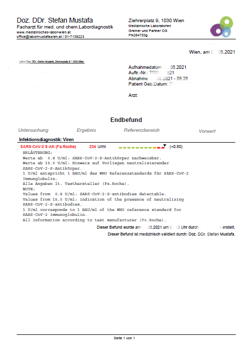 怀着这样的好奇心,一位生活在奥地利、已接种中国国药新冠灭活疫苗的《维城》热心读者通过奥华旅行社联系到维也纳一医学实验室对自己体内的新冠病毒抗体进行检测,其检测结果如下: