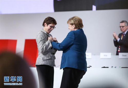 12月7日,在德国汉堡,德国基督教民主联盟(基民盟)新主席克兰普-卡伦鲍尔(左)在胜选后接受德国总理、前任党主席默克尔祝贺。 (图片来源:新华网)