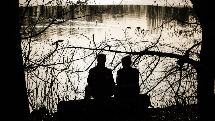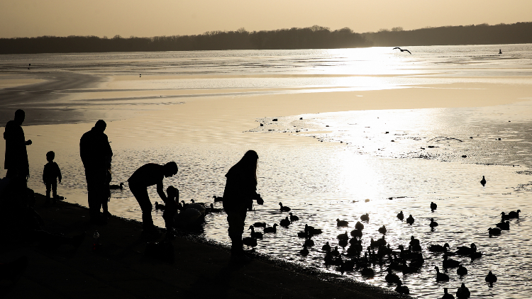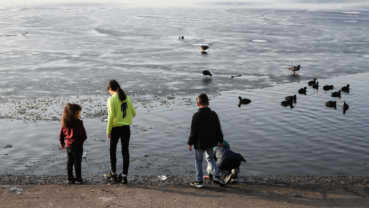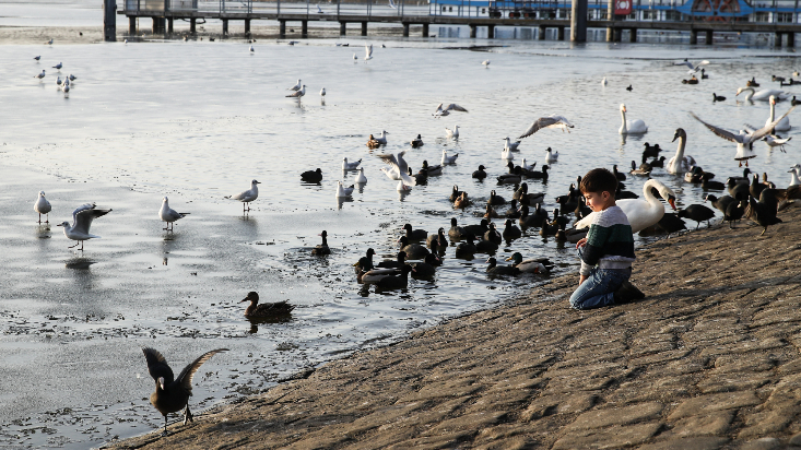 孩子们在湖畔嬉戏享受暖阳。
