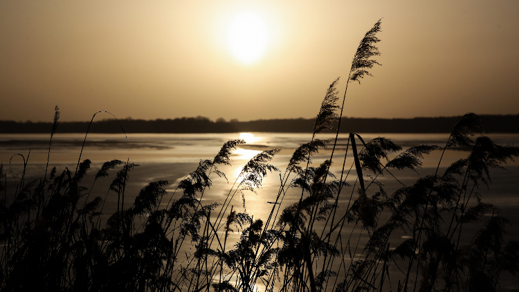泰格尔湖畔的芦苇在阳光下摇曳。