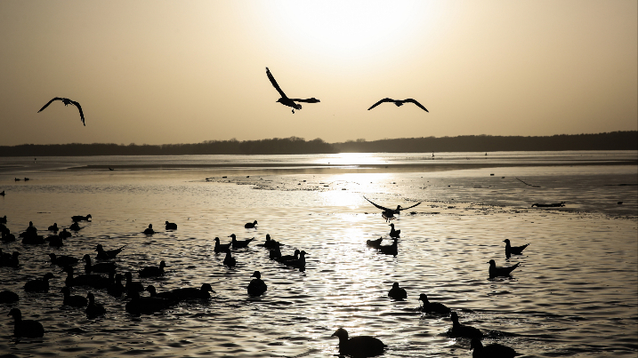 水鸟在泰格尔湖面上游弋和飞翔。