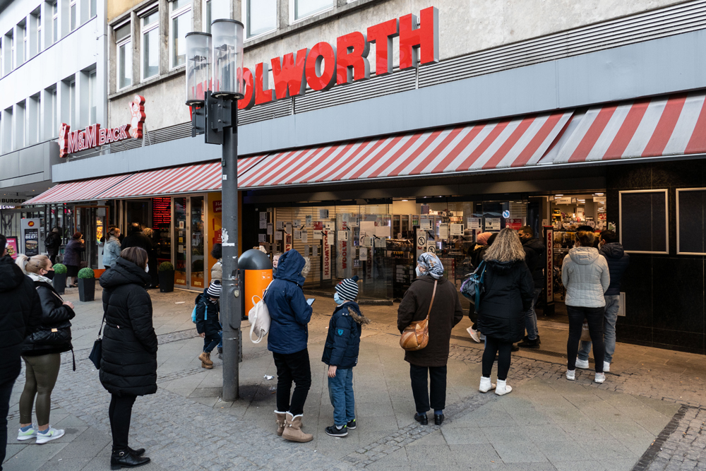 3月9日,人们在德国首都柏林排队等候进入一家商店。(图片来源:新华社)