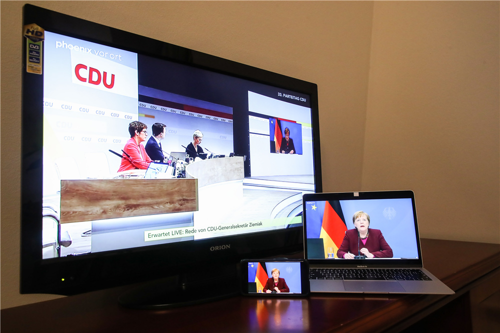 这是1月15日在德国首都柏林拍摄的德国总理默克尔(右)在基督教民主联盟(基民盟)线上党代会致辞的视频直播画面。(图片来源:新华社)