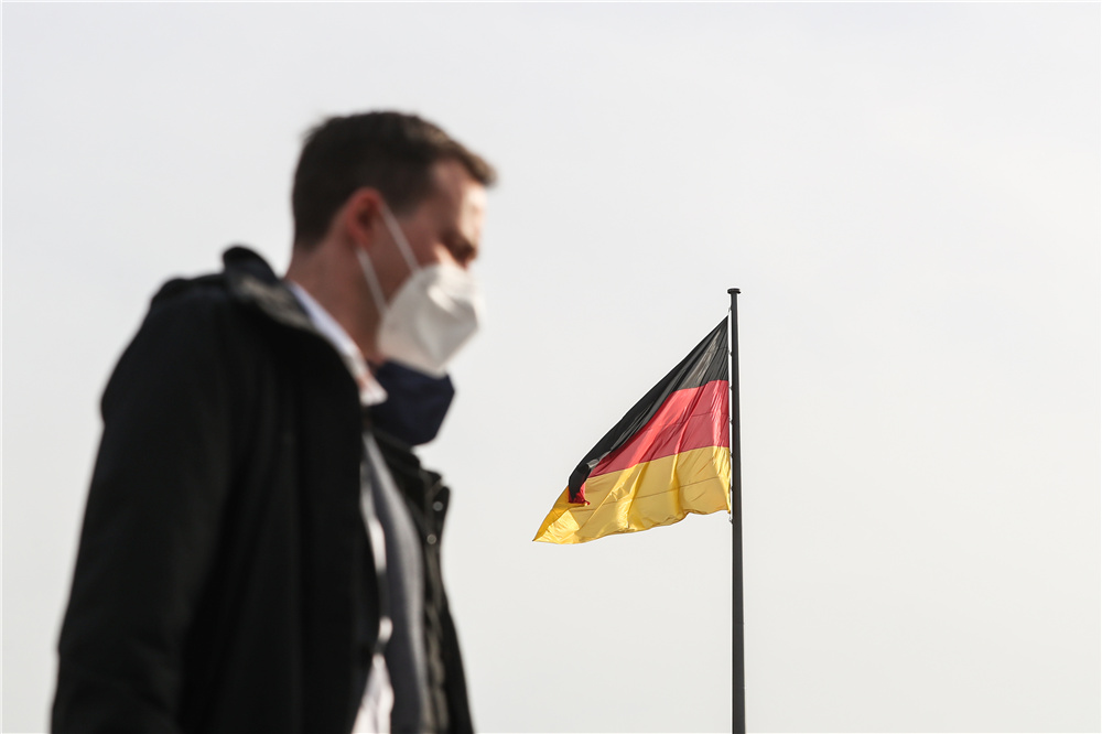 3月3日,在德国首都柏林,一名佩戴口罩的行人经过一面德国国旗。(图片来源:新华社)
