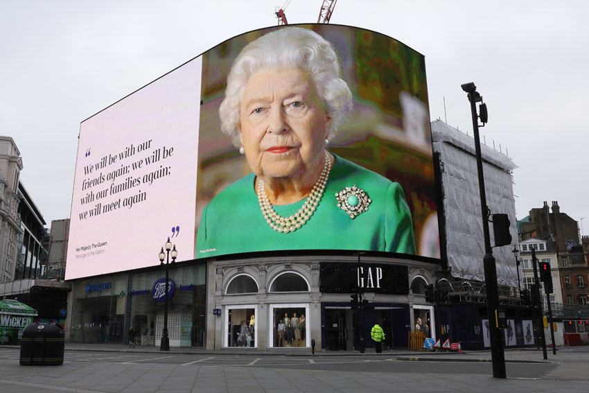 英国伦敦皮卡迪利广场大屏幕展示女王的照片。(图片来源:新华社)