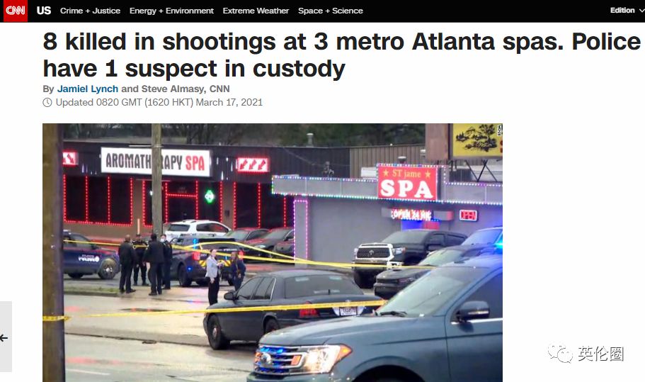 CNN:发生在亚特兰大的3个都市水疗中心的枪击事件,8人死亡。警方拘留了1名嫌犯。(图片来源:CNN新闻截图)