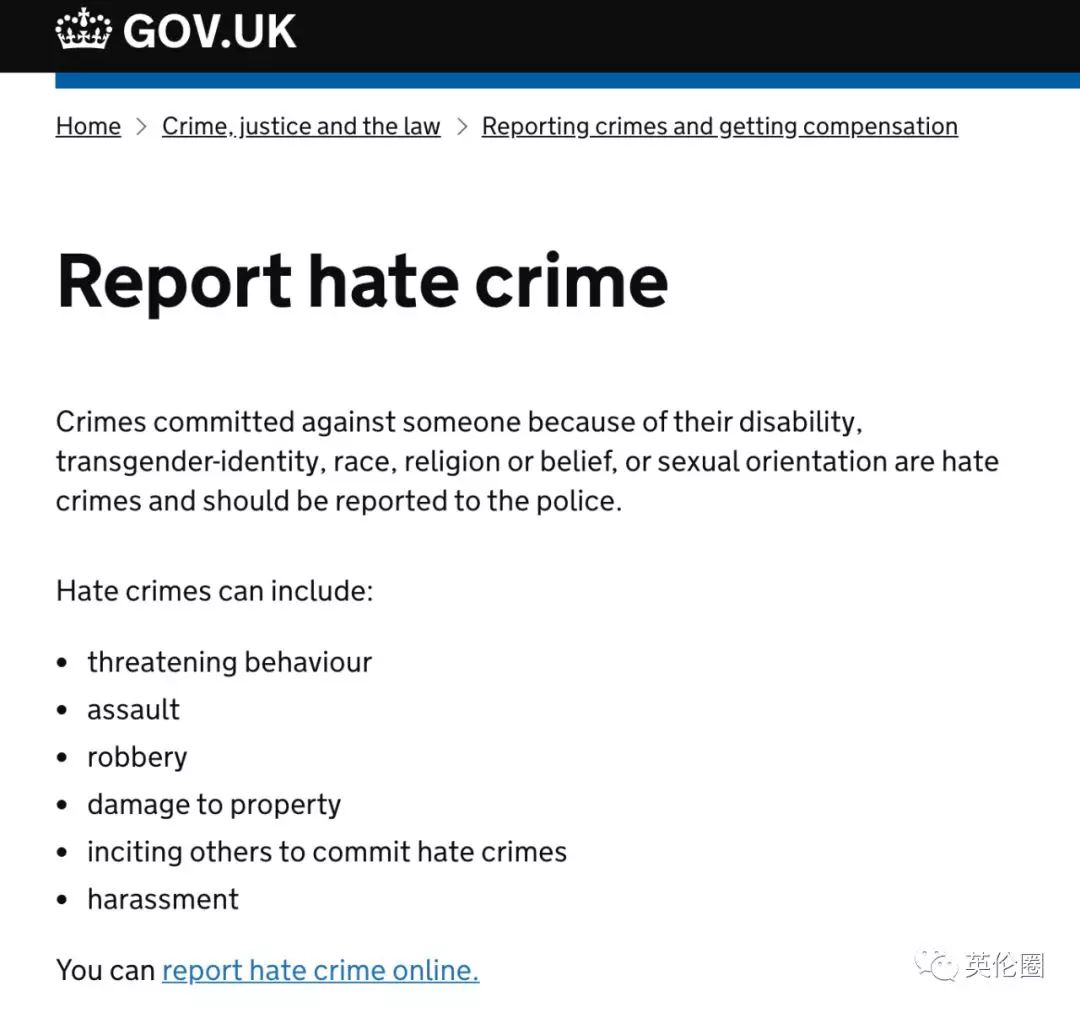 这就意味着,当你认为某人的行为是基于种族主义的,那么你就可以把它记录下来并报告给警方。一些严重的种族歧视行为会上升为刑事犯罪,被归到仇恨犯罪中(hate crime)。