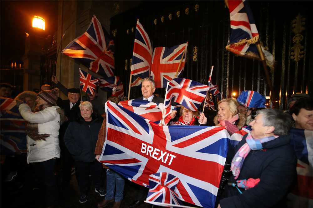 2020年1月31日晚,在英国北爱尔兰贝尔法斯特,支持“脱欧”的人们参加庆祝集会。(图片来源:新华社)