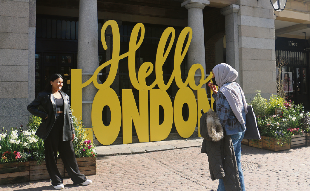科文特花园一角,两名路人在“Hello London”标牌前拍照留念。(图片来源:欧洲时报英国版)