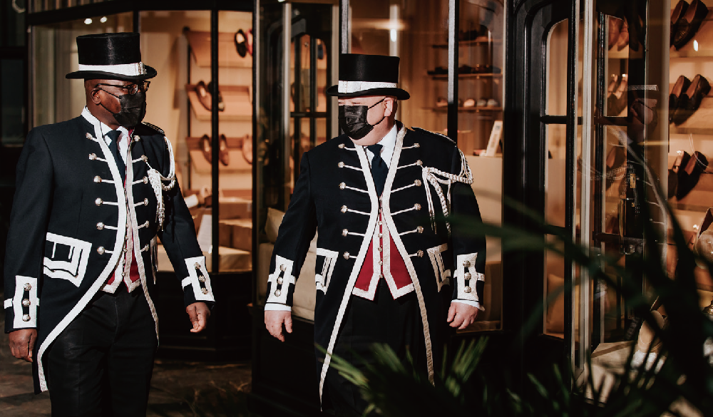 位于伦敦市中心的伯灵顿拱廊有独特的侍卫(Beadles)传统,他们担任着接待全球顾客的重任,解封当天侍卫们整装待发。(图片来源:欧洲时报英国版)
