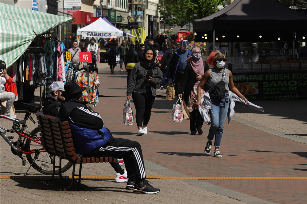 5月19日,人们走在英国贝德福德街头。(图片来源:新华社)