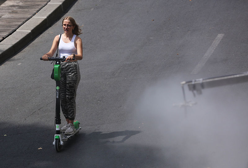 在巴黎塞纳河畔,一名女子经过市政府设置的降温设施。(图片来源:新华社)