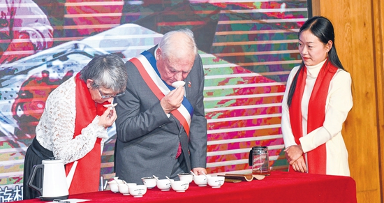 武夷岩茶高级评茶师向法国梅多克地区政府联盟主席、凯阳市市长亨利先生夫妇介绍武夷岩茶特征后,让客人感受武夷岩茶的岩韵香。