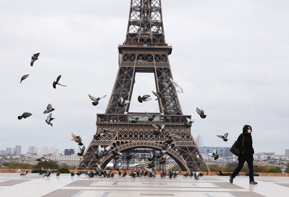 10月30日,一名女子走过法国巴黎埃菲尔铁塔附近的特罗卡德罗广场。(图片来源:新华社)