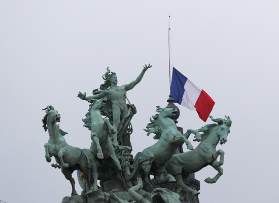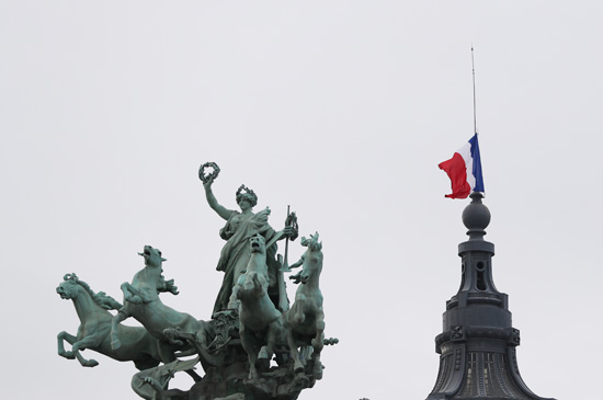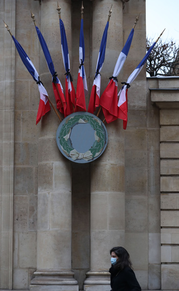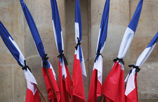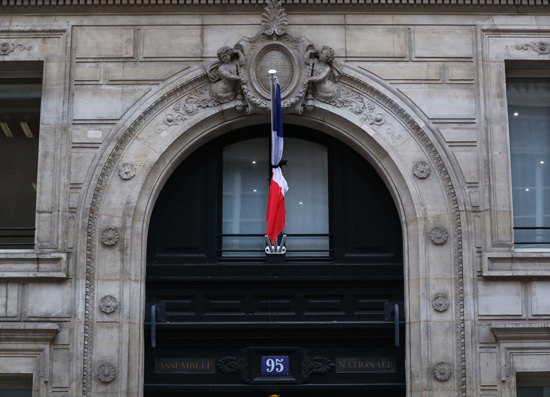 法国巴黎国民议会外的国旗用黑丝带束起。