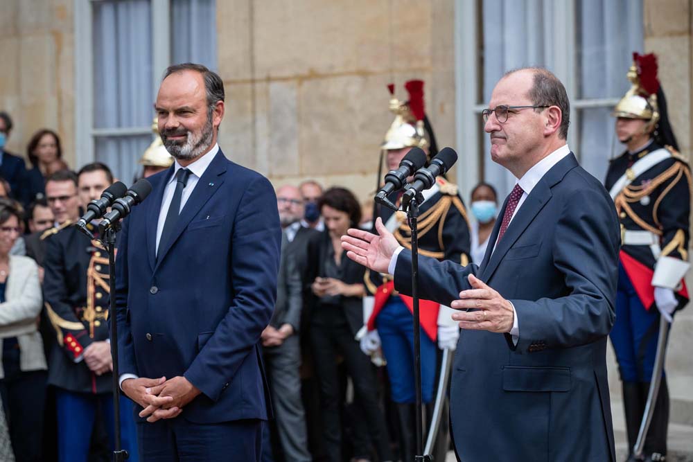 2020年7月3日,卸任总理爱德华·菲利普(左)与新任总理让·卡斯泰(右)出席权力交接仪式。(图片来源:新华社)