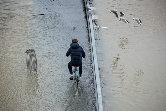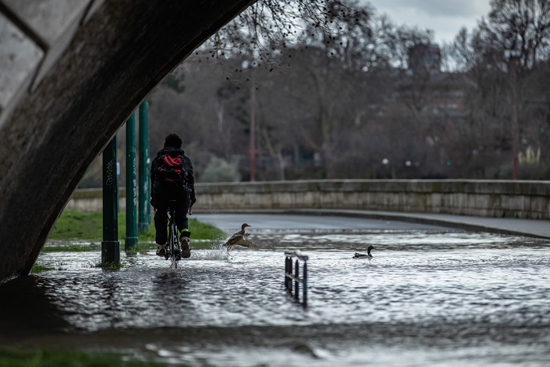 一名男子骑车经过法国巴黎涨水的塞纳河畔。